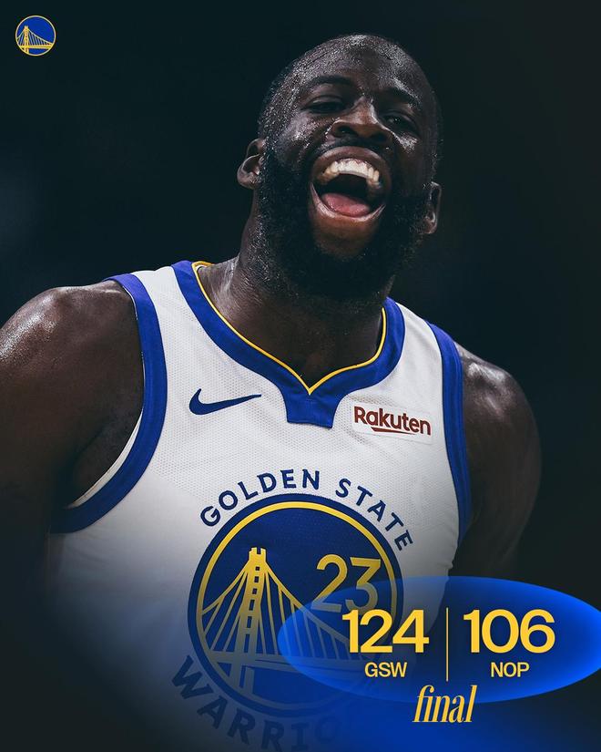末节决战,勇士众将继续高举进攻大旗,穆迪暴扣,金州继续狂下三分雨,并一度将分差扩大至25分。比赛早早失去了悬念,距离终场不足5分钟之际,鹈鹕落后22分并换上大部分板凳席末端的球员,选择提前弃子认负,比赛逐渐失去了悬念。两队开始在场上练兵,最终,勇士以124比106完胜对手,得以实现3连胜。本场比赛勇士投进24记三分球,创球队本赛季新高。